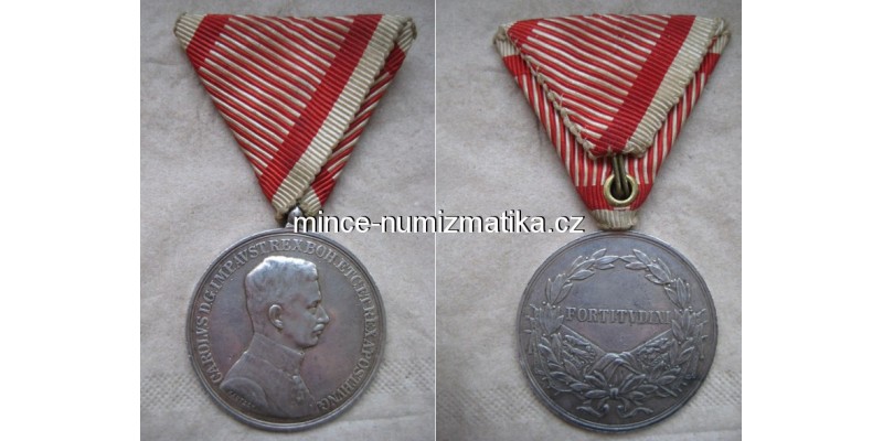 Medaile - Stříbrná medaile FORTITVDINI Karel I. Ag stříbrná na původní vojenské stuze, Velká 40mm průměr