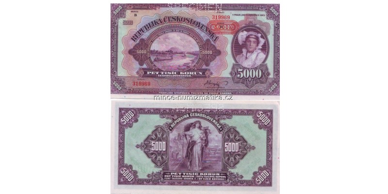 5000 Korun 1920 serie B s přetiskem - UNC perf - 5000Kčs