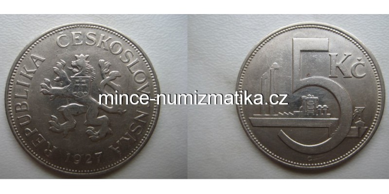 5Kč 1927 RR, nejvzácnější prvorepubliková pětikoruna. nádherný stav +1/1+ (viz fotografie)